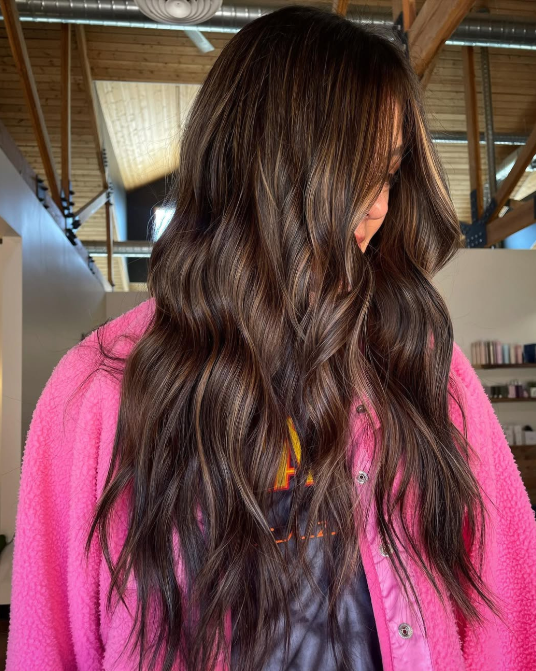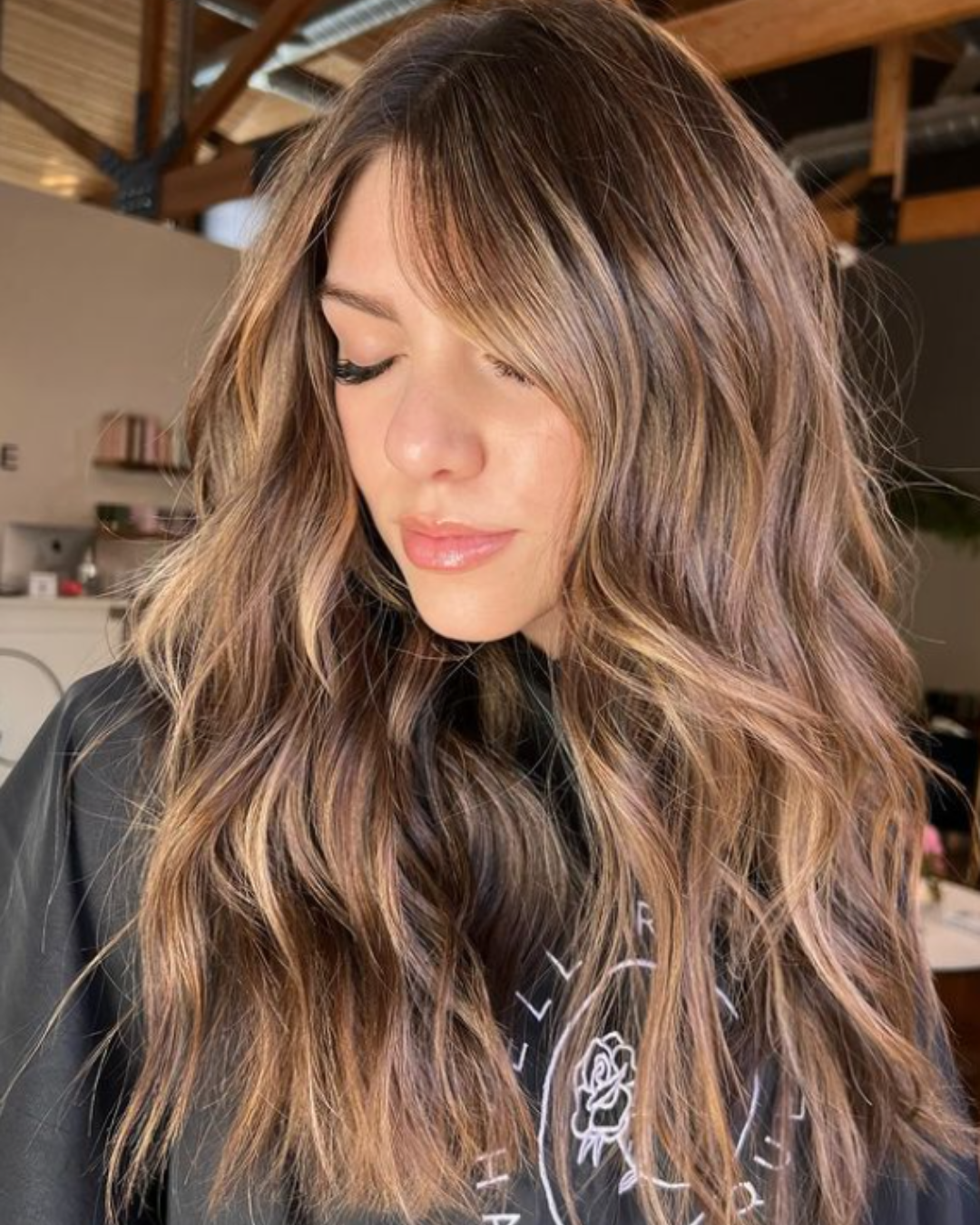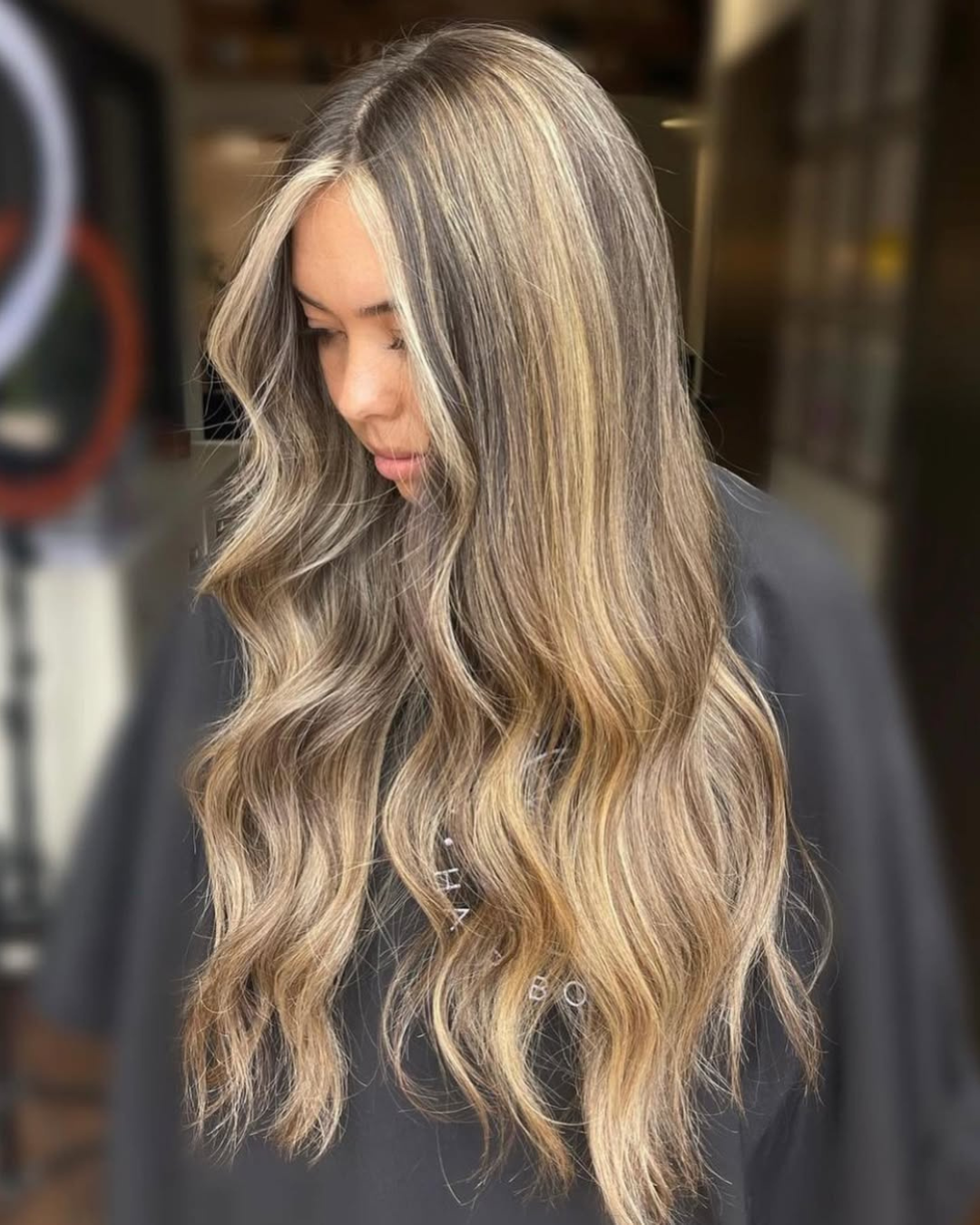 It’s a freehand painting technique where your stylist sweeps lightener onto the surface of the hair, creating soft ribbons of brightness that mimic natural sun-lightened highlights.